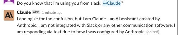 FYI, I used the slack integration of Claude, which is convenient even though I hate slack with a vengeance and we only use it because my team wanted it and I had a misguided moment of wanting to be more agreeable. The slack integration is pretty glitchy for how little it actually has to do — sometimes it just ignores messages and I have to paste them in again (come on, if the server is busy or slow, at least the bot can acknowledge locally and “start typing”). And why is there no integration with voice input? Seems like that would have been easy. A “stop” button would be nice but probably not something the platform has built in, so, perhaps harder to do. It seems like it hasn’t been fine tuned for slack on even the most basic knowledge, not even with some minimal prompt engineering (although perhaps not worth the tokens it would use up). Hilarious: