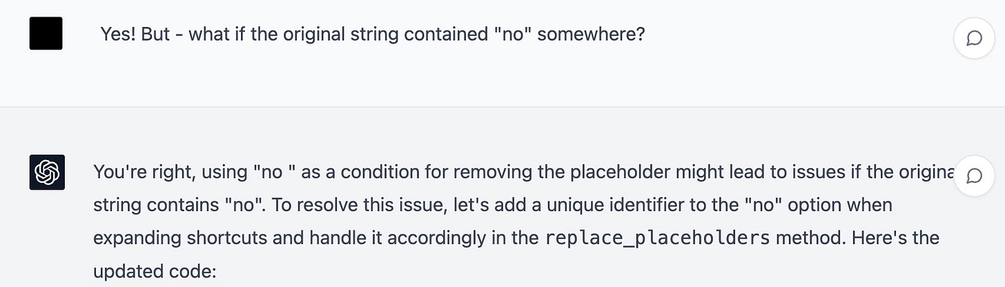 Meanwhile, ChatGPT did so well that I added another feature, which it also implemented correctly. Also remarkable were its responses to prompts from me that were not carefully phrased or even thought through for more than 3 seconds: